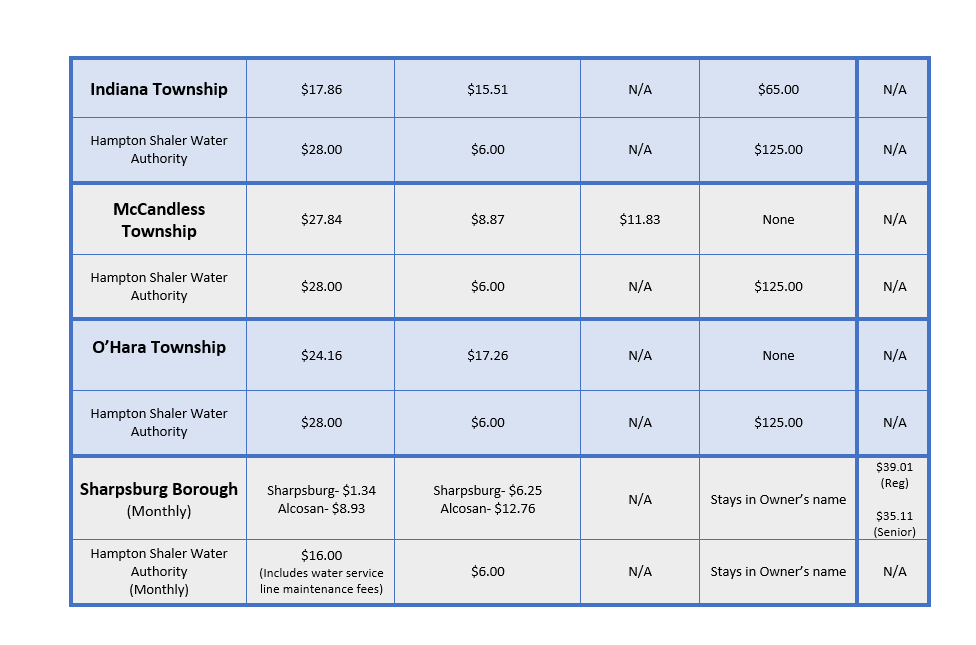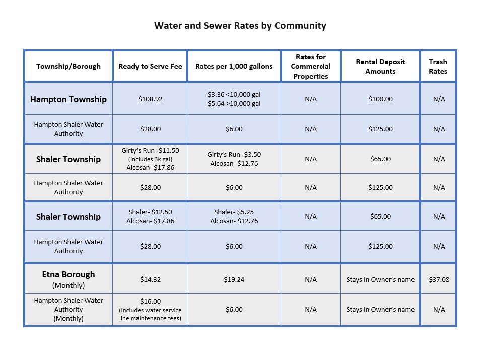 Hampton Shaler Water Authority (HSWA) understands that it can be confusing to decipher all the charges on your water bill. HSWA sets the current water service and consumption charges, the clean water entering your home or business. All other charges are the rates provided by the municipalities, in the HSWA service area. A chart outlining the rates separated by the community can be seen below.
