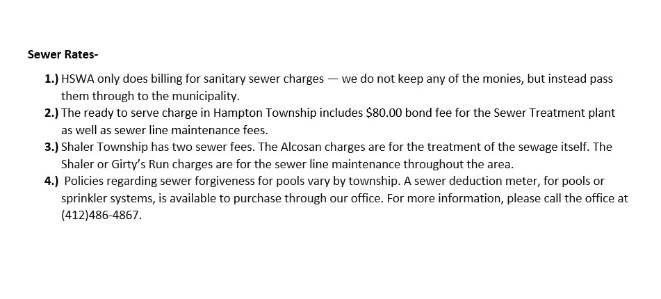 Please keep in mind that HSWA bills for the sewage and trash services as a courtesy to these municipalities. We do not keep any of those monies and they are passed through to the host municipalities.